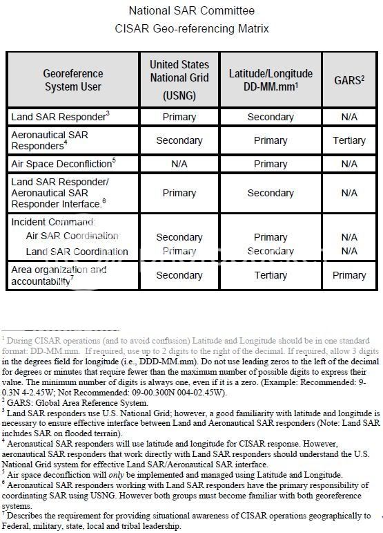 Unfortunately, they also decided that it was the responsibility of the Airborne folks to translate their Lat/Long info into USNG when interoperating with Land SAR folks.