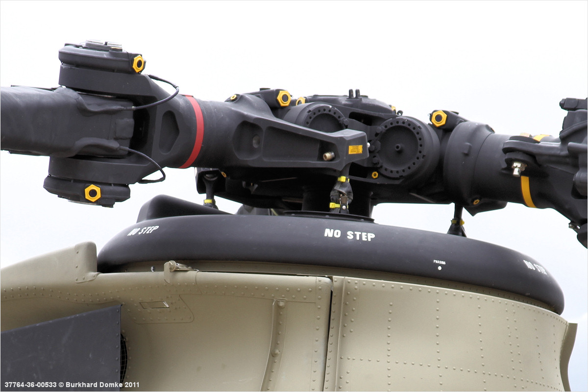 The blade grounding wires were sort of an afterthought when they went to Fiberglass Reinforced Blades from the old metal blades, so when they were added, nobody thought hard about the dynamics.  The wires would beat or rub against the pitch varying housing, at the very least taking off the paint but often causing wear to the metal.  We put carefully cut pieces of Army Green duct tape on the rotor heads under the grounding wires to mitigate the wear.  Now it seems they changed the design of the lower half of the grounding wire to stiffen it as a standoff.